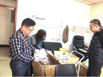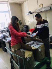 图为校企合作部工作人员将捐赠物资与学院后勤管理部门交接